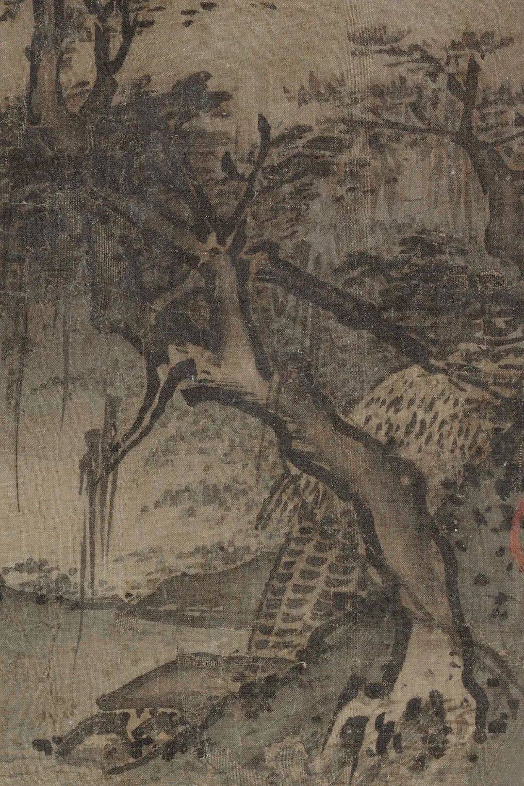 更妙的是,夏圭用秃笔带水的“拖泥带水皴”描绘山石,墨色由浓至淡的渐变,恰似琴音从激越到舒缓的过渡;而茅屋的规则点皴与树叶的疏密点染,又形成人工与自然的声学对话。当文人画以“无声胜有声”为尚时,夏圭却用一幅“未闻琴声”的画,让观者“耳”中生响——这或许正是南宋偏安一隅的文人,借山水琴音对“无声政治”的隐晦回应。