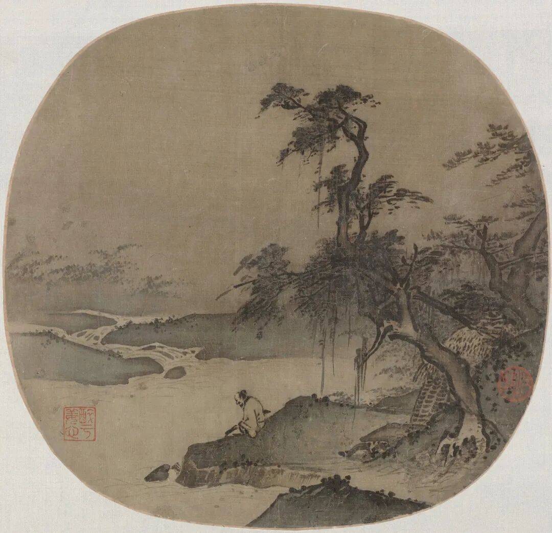 夏圭的《临流抚琴图》常被归为南宋“半边式”构图的典范,但若抛开视觉框架,这幅25.5×26厘米的扇面画实则构建了一个“以音破画”的声景宇宙。画中高士临溪抚琴,琴身仅露一角,琴弦与手指皆隐于留白,但观者却能通过溪水的盘曲掩映、古松的偃仰屈曲,以及茅屋点皴的节奏感,“听”到琴声与流水、松涛的共振。